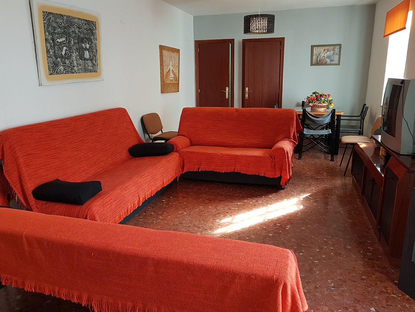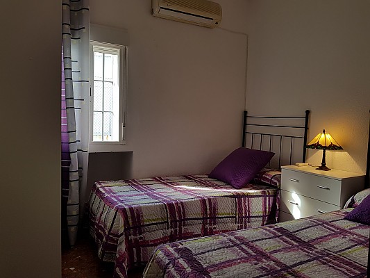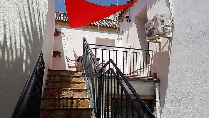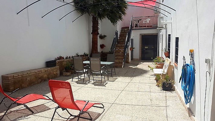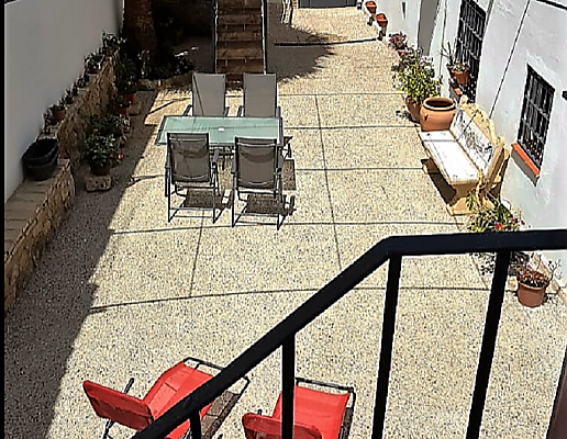 El alojamiento consta de dos dormitorios, uno de ellos con cama de matrimonio y un sofá cama doble, y otro con 2 camas individuales. En el salón hay 1 sofá cama doble. Tiene aire acondicionado, WiFi, y una preciosa terraza que da al patio privado de la casa.
